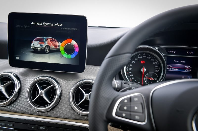 ภายในรุ่น GLA 250 AMG Dynamic โดดเด่นไปกับระบบมัลติมีเดียรุ่นใหม่ อาทิ หน้าจอขนาด 8 นิ้วและชุดมาตรวัด มีระบบกุญแจแบบ KEYLESS-GO และระบบ HANDFREE ACCESS สำหรับเปิดประตูท้ายได้ แต่งเบาะนั่งหุ้มหนัง ARTICO สลับ DINAMICA microfibre สีดำ ตกแต่งด้วยด้ายสีแดง ชุดคันเร่งและแป้นเบรกแบบสปอร์ต