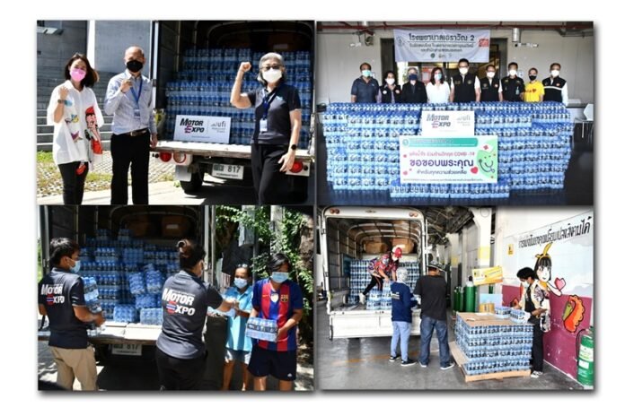 ผู้บริหาร บริษัท สื่อสากล จำกัด ผู้จัดงาน “มหกรรมยานยนต์” หรือ “Thailand International Motor Expo” ส่งมอบน้ำดื่ม 6,000 ขวด ให้ “รพ.เอราวัณ2” “มูลนิธิกระจกเงา” และ “แคมป์คนงานพระราม9 กรุงเทพฯ” เพื่อนำไปช่วยผู้ประสบภัยจากโรคระบาด COVID-19 เมื่อวันที่ 9-10 สิงหาคม 2564 ที่ผ่านมา
