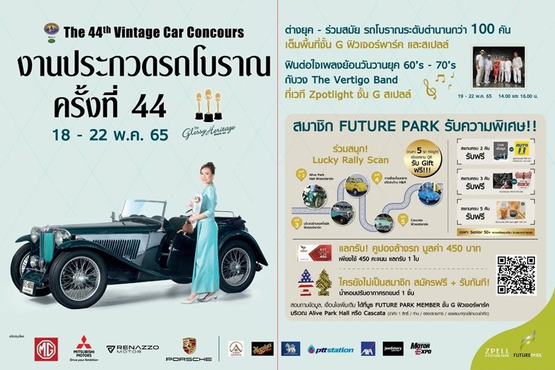 เชิญชม “งานประกวดรถโบราณ ครั้งที่ 44” ณ ชั้น G ศูนย์การค้าฟิวเจอร์พาร์ค และสเปลล์ ตั้งแต่วันนี้-22 พฤษภาคม 2565 ติดตามรายละเอียดเพิ่มเติมได้ที่ www.vintagecarclub.or.th และ www.facebook.com/VintageCarClub