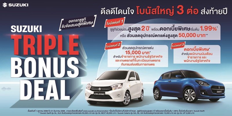 ซูซูกิ ยังเตรียมข้อเสนอสุดพิเศษสำหรับลูกค้าทุกท่านให้สามารถเป็นเจ้าของรถยนต์ซูซูกิทุกรุ่นได้ง่ายยิ่งขึ้น เพียงจองรถภายในงานมหกรรมยานยนต์นี้ รับแคมเปญพิเศษ “SUZUKI TRIPLE BONUS DEAL” ดีลโดนใจ โบนัสใหญ่ 3 ต่อ ส่งท้ายปี มอบให้ลูกค้าที่จองและรับรถยนต์ซูซูกิ ตั้งแต่วันนี้ถึง วันที่ 31 ธันวาคม 2566 ซูซูกิช่วยผ่อน เดือนละ 1,500 บาท นาน 2 ปี หรือ เลือกรับส่วนลดอุปกรณ์ตกแต่งสูงสุด 50,000 บาท (เฉพาะรุ่นที่ร่วมรายการ) หรือเลือกรับดอกเบี้ยพิเศษ 0% พิเศษ! ส่วนลดเพิ่มเติมอีก 15,000 บาท สำหรับข้าราชการ รัฐวิสาหกิจ บุคลากรทางการแพทย์ หรือ เกษตรกรผู้ขึ้นทะเบียนเกษตรกร พร้อม ฟรีประกันภัยชั้นหนึ่งในปีแรกสำหรับรถยนต์ซูซูกิทุกรุ่น