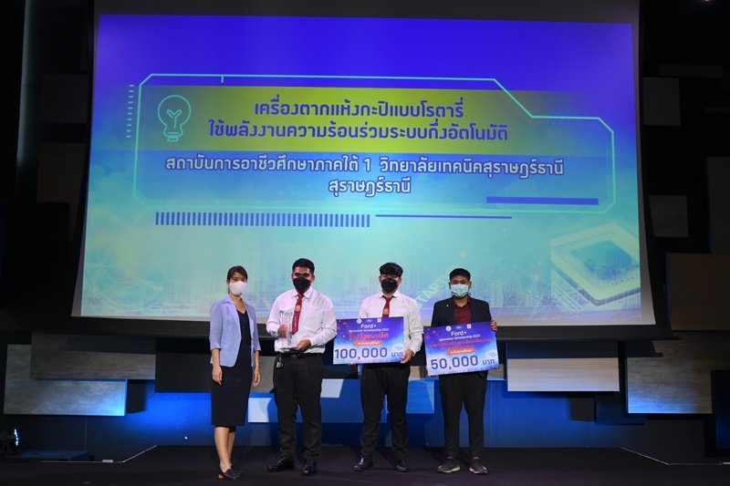 ฟอร์ด ประเทศไทย ร่วมกับสมาคมพัฒนาประชากรและชุมชน ทีวีบูรพา และสถาบันวิทยาการหุ่นยนต์ภาคสนาม (FIBO) จัดเวทีประกวดโครงงานสิ่งประดิษฐ์ โครงการ Ford+ Innovator Scholarship 2021 ในหัวข้อ นวัตกรรมพลังบวกเพื่อโลกที่น่าอยู่ (Plus For A Better World Challenge) เพื่อสนับสนุนความคิดสร้างสรรค์ที่มีโอกาสต่อยอดให้เกิดขึ้นจริงโดยคำนึงถึงการพัฒนาเพื่อยกระดับคุณภาพชีวิตใน 3 มิติ ได้แก่ ด้านสุขภาพ ความปลอดภัยและภัยพิบัติ และการพัฒนาอาชีพและธุรกิจสตาร์ทอัพ ในปีนี้ ทีมนวัตกรรุ่นใหม่ที่ได้รับรางวัลชนะเลิศมาจากจังหวัดสุราษฎร์ธานี ได้แก่ วิทยาลัยเทคนิคสุราษฎร์ธานี ในระดับอาชีวศึกษา และสถาบันอาชีวศึกษาภาคใต้ 1 วิทยาลัยเทคนิคสุราษฎร์ธานี ในระดับอุดมศึกษา โดยการนำเสนอผลงานรอบชิงชนะเลิศจัดขึ้น ณ อาคารเคเอ็กซ์ Knowledge Exchange