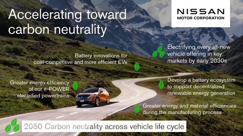นิสสัน มอเตอร์ กำหนดเป้าหมายลดคาร์บอนเป็นศูนย์จากทั้งกระบวนการผลิต และวงจรชีวิตผลิตภัณฑ์ ของบริษัท ซึ่งจะส่งผลให้รถยนต์นิสสันทุกรุ่นที่จะออกสู่ตลาดภายในช่วงต้นทศวรรษ 2030 จะเป็นรถยนต์ไฟฟ้า 100% ทั้งหมด