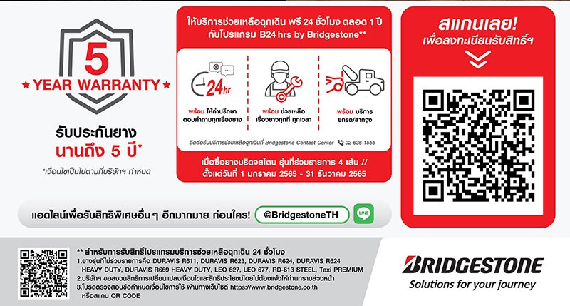 บริดจสโตน จัดโปรโมชั่นพิเศษ “B-24 hrs. บริการช่วยเหลือฉุกเฉิน 24 ชั่วโมง ฟรี 1 ปี” สำหรับลูกค้าที่ซื้อยางบริดจสโตนรุ่นที่ร่วมรายการ จำนวน 4 เส้น และลงทะเบียนรับประกันยาง* ผ่านไลน์ @bridgestoneTH หรือ ผ่านเว็บไซต์ https://www.bridgestone.co.th/th/customer-care/tire-registration ตั้งแต่วันนี้ ถึง 31 ธันวาคม 2565