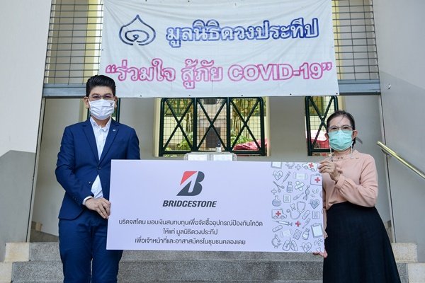 ทั้งนี้ บริดจสโตน ประเทศไทย พร้อมทั้งพนักงานในเครือบริดจสโตน 4 บริษัทฯ คือ บริษัท ไทยบริดจสโตน จำกัด บริษัท บริดจสโตนเซลส์ (ประเทศไทย) จำกัด บริษัท บริดจสโตน เอ.ซี.ที. (ประเทศไทย) จำกัด และ บริษัท ทีบีเอสซีโลจิสติกส์ จำกัด ได้ร่วมกันบริจาคเงินเพื่อสมทบทุนจัดซื้ออุปกรณ์ป้องกันโควิด-19 และชุด PPE สำหรับโรงพยาบาลสนามธรรมศาสตร์ (โรงพยาบาลธรรมศาสตร์เฉลิมพระเกียรติ) จำนวน 219,750.50 บาท สำหรับเจ้าหน้าที่และอาสาสมัครในชุมชนคลองเตย มูลนิธิดวงประทีป จำนวน 218,150.50 บาท และมอบเงินสมทบทุนสำหรับรถเก็บตัวอย่างชีวนิรภัย SWAB Mobile Unit ให้แก่ มูลนิธิโรงพยาบาลพระจอมเกล้าเจ้าคุณทหาร จำนวน 115,651 บาท รวมทั้งสิ้นเป็นจำนวนเงิน 553,552 บาท
