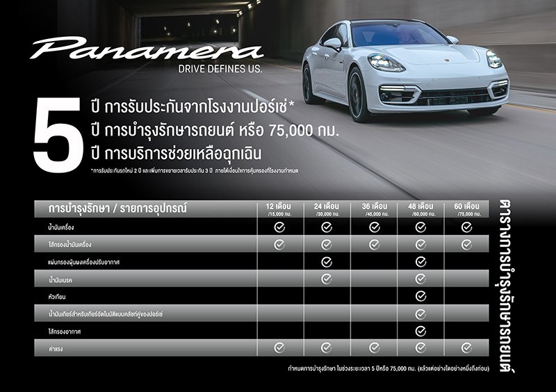 การรับประกันจากโรงงานปอร์เช่ ตลอดระยะเวลา 5 ปี  เพื่อให้ท่านมั่นใจได้กับคุณภาพและสมรรถนะของรถปอร์เช่ พานาเมร่า (G2 II)  คู่ใจของท่านได้ยาวนานยิ่งขึ้น เราจึงขยายระยะเวลาการรับประกันจากโรงงานปกติ 2 ปี เพิ่มเติมอีก 3 ปี รวมเป็น 5 ปีเต็ม*