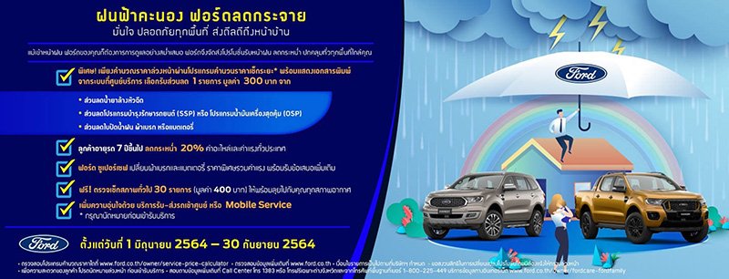 ฟอร์ด ประเทศไทย เปิดตัวแคมเปญ ‘ฝนฟ้าคะนอง ฟอร์ดลดกระจาย’ รับหน้าฝนจัดโปรโมชั่นและข้อเสนอด้านบริการแบบครบครัน เพื่อมอบความอุ่นใจให้กับลูกค้าครอบครัวฟอร์ดตลอดช่วงฤดูฝนนี้ อาทิ ส่วนลดพิเศษสำหรับการเข้ารับบริการเช็กระยะเมื่อแสดงเอกสารจากโปรแกรมการคำนวนราคา (Service Price Calculator) ตรวจเช็คสภาพทั่วไปฟรี 30 รายการ และยังมีส่วนลดค่าอะไหล่ถึง 20% รวมถึงบริการรับและส่งมอบรถนอกสถานที่และหน่วยบริการเคลื่อนที่ Mobile Service และสำหรับรถยนต์ฟอร์ด เอเวอเรสต์ รุ่น Titanium+ รับฟรี ชุดวัดแรงดันลมยาง (TPMS) เมื่อเปลี่ยนยางรถยนต์ 4 เส้น เพียงนำรถเข้ารับบริการที่ศูนย์บริการฟอร์ดทั่วประเทศตั้งแต่วันที่ 1 มิถุนายน 2564 – 30 กันยายน 2564