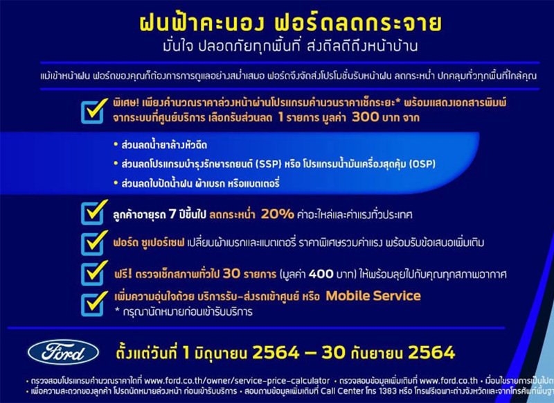 สำหรับแคมเปญที่จะยกระดับการบริการมอบความอุ่นใจตลอดช่วงฤดูฝนนี้ ฟอร์ดมอบส่วนลดพิเศษสำหรับลูกค้าที่เข้ารับบริการเช็กระยะที่แสดงเอกสารจากโปรแกรมการคำนวนราคาค่าใช้จ่ายในการบำรุงรักษาเช็กระยะ (Service Price Calculator) โดยลูกค้าสามารถเข้าไปคำนวณราคาผ่านทางเว็บไซต์ฟอร์ด ประเทศไทย: https://www.ford.co.th/owner/service-price-calculator/  แคมเปญนี้มอบให้กับลูกค้ารถฟอร์ดทุกรุ่น ไม่จำกัดระยะทาง โดยสามารถเลือกรับส่วนลดพิเศษ 1 รายการ จากรายการดังต่อไปนี้