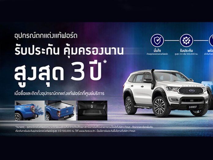ฟอร์ด ประเทศไทย เปิดตัวแคมเปญรับประกันคุณภาพอุปกรณ์ตกแต่งแท้ฟอร์ดนานสูงสุดถึง 3 ปี หรือ 100,000 กิโลเมตร เพื่อเสริมความมั่นใจในคุณภาพและความคุ้มค่าจากการติดตั้งอุปกรณ์ตกแต่งแท้โดยช่างผู้ชำนาญจากศูนย์บริการฟอร์ด สำหรับลูกค้า ฟอร์ด เรนเจอร์ ฟอร์ด เรนเจอร์ แร็พเตอร์ และฟอร์ด เอเวอเรสต์ ทั้งลูกค้าใหม่และลูกค้าปัจจุบัน พิเศษ ลูกค้าที่ซื้อรถยนต์ใหม่สามารถนำยอดซื้ออุปกรณ์ตกแต่งแท้ฟอร์ดรวมจัดสินเชื่อกับรถใหม่ และลูกค้าปัจจุบันสามารถผ่อนชำระ 0% ได้นานสูงสุด 10 เดือน เมื่อซื้ออุปกรณ์ตกแต่งแท้ฟอร์ดตั้งแต่ 5,000 บาทขึ้นไป ข้อเสนอการผ่อนสุดพิเศษเริ่มแล้วตั้งแต่วันที่ 15 กันยายน 2564 จนถึง 31 ธันวาคม 2564