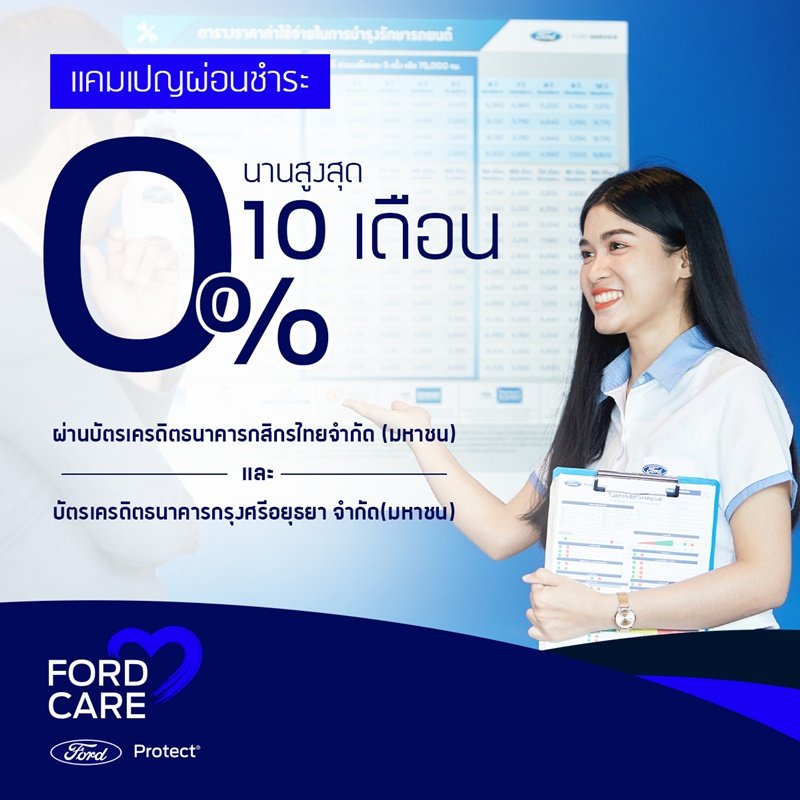 ทั้งนี้ ลูกค้ารถใหม่สามารถนำราคาแพ็กเกจไปจัดยอดสินเชื่อรวมกับราคารถยนต์ได้ หรือสามารถเลือกผ่อนชำระค่าโปรแกรมฟอร์ดแคร์แบบ 0% นานสูงสุด 10 เดือนผ่านบัตรเครดิตธนาคารกสิกรไทยจำกัด (มหาชน) และบัตรเครดิตธนาคารกรุงศรีอยุธยา จำกัด(มหาชน) ได้ทุกแพ็กเกจ เฉพาะหน้าบัตรที่ร่วมรายการ
