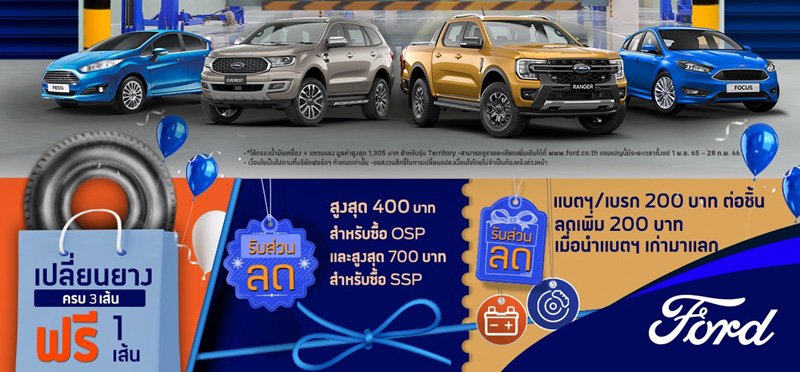 ฟอร์ด ประเทศไทย จัดแคมเปญพิเศษมอบข้อเสนอสุดคุ้มด้านบริการที่คัดสรรมาให้ลูกค้าฟอร์ดอุ่นใจตลอดการเดินทาง ไม่ว่าจะเป็นส่วนลดสำหรับโปรแกรมน้ำมันเครื่องสุดคุ้ม ส่วนลดสำหรับโปรแกรมบำรุงรักษารถยนต์ (SSP) ซื้อยางรถยนต์ 3 เส้น แถมฟรี 1 เส้น รวมถึงส่วนลดเมื่อเข้ารับบริการเปลี่ยนแบตเตอรี่หรือผ้าเบรก และบริการตรวจเช็คสภาพรถ 30 รายการฟรี นอกจากนี้ ลูกค้าที่ใช้บริการเช็กระยะจากรถให้บริการเคลื่อนที่ (Mobile Service Vehicle) จะได้รับฟรีไส้กรองน้ำมันเครื่องและแหวนรอง โดยลูกค้าฟอร์ดที่สนใจสามารถนำรถเข้ารับบริการได้ที่ศูนย์บริการฟอร์ดทั่วประเทศ ตั้งแต่วันนี้ ถึง 28 กุมภาพันธ์ 2566