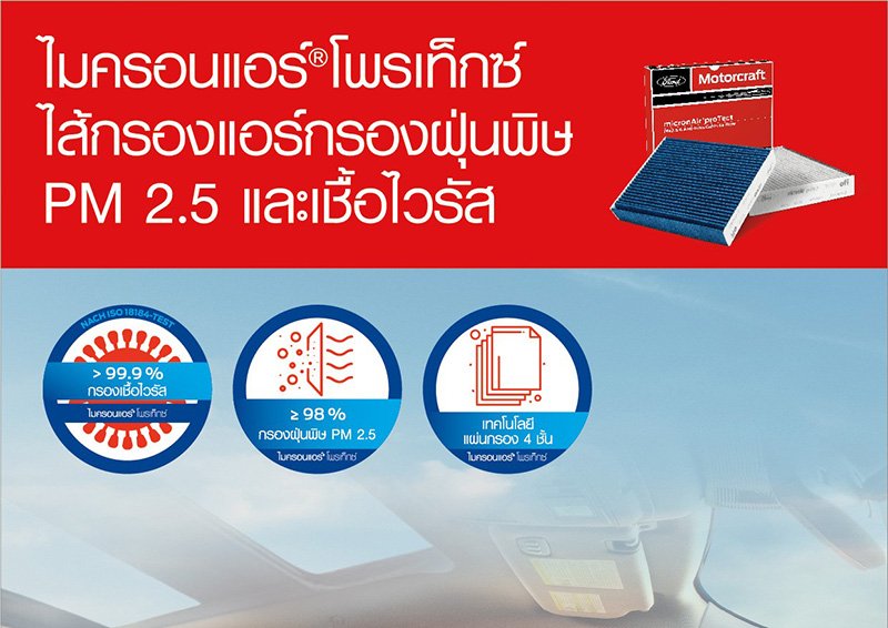 ฟอร์ด ประเทศไทย เปิดตัว ไมครอนแอร์® โพรเท็กซ์ ไส้กรองแอร์คุณภาพสูงรุ่นใหม่ภายใต้แบรนด์มอเตอร์คราฟท์ที่จะช่วยให้อากาศในห้องโดยสารสะอาดและบริสุทธิ์ด้วยคุณสมบัติในการกรองฝุ่น PM2.5 ปกป้องและยับยั้งการเติบของเชื้อไวรัสและแบคทีเรีย ลดสารก่อภูมิแพ้ ควัน และอนุภาคอื่นๆ รวมถึงดูดซับแก๊สหรือกลิ่นไม่พึงประสงค์จากภายนอกได้อย่างดีเยี่ยม ไส้กรองแอร์ ไมครอนแอร์® โพรเท็กซ์ พร้อมจำหน่ายและติดตั้งแล้ววันนี้สำหรับรถฟอร์ด เรนเจอร์ ตั้งแต่รุ่นปี 2011 และฟอร์ด เอเวอเรสต์ ตั้งแต่รุ่นปี 2015 ที่ศูนย์บริการฟอร์ดทั่วประเทศ