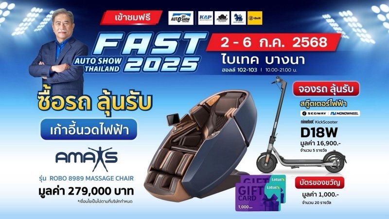ในส่วนของกิจกรรม “ซื้อรถ ลุ้นรับ” ในปีนี้ ผู้จองรถและซื้อรถทุกคันในงาน ไม่เพียงได้สิทธิ์ลุ้นรับรางวัลใหญ่เป็นเก้าอี้นวดไฟฟ้ารุ่น ROBO 8989 Massage Chair จาก เอแม็กซ์ (Amaxs) แบรนด์เก้าอี้นวดไฟฟ้าและเครื่องออกกำลังกายที่ส่งเสริมสุขภาพที่ดีแบบองค์รวม ด้วยเทคโนโลยีและนวัตกรรมที่ส่งเสริมสุขภาพ มูลค่า 279,000 บาท จำนวน 1 รางวัล และของรางวัลอีกมากมายหลังจบงานเท่านั้น แต่ยังได้สิทธิ์ลุ้นรับรางวัลประจำวันเป็นสกู๊ตเตอร์ไฟฟ้า Segway รุ่น Ninebot KickScooter D18W มูลค่า 16,900 บาท จาก MONOWHEEL จำนวน 5 รางวัล หรือแค่แวะมาชมงานและร่วมสนุกกับกิจกรรม “แชร์มา รับไป” เพื่อลุ้นรับรางวัลอีกมากมาย ติดตามรายละเอียดได้ที่ Facebook: FAST AUTO SHOW ทั้งนี้ งาน “ฟาสต์ ออโต โชว์ ไทยแลนด์ 2025” ยังเป็นพื้นที่ PET Friendly สามารถนำสัตว์เลี้ยงแสนรักที่ได้รับอนุญาตตามข้อกำหนดเข้ามาชมงานได้อีกด้วย