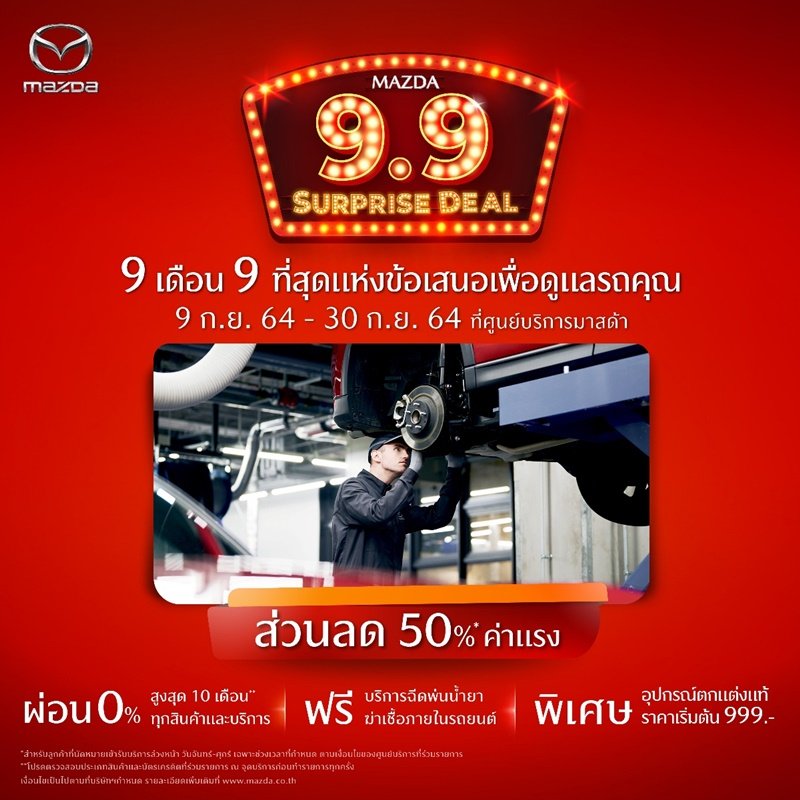 มาสด้าอัดแคมเปญแรง “Mazda 9.9 Surprise Deal” 9 เดือน 9 กับที่สุดแห่งข้อเสนอ มอบความพิเศษให้ลูกค้าที่สนใจออกรถใหม่ ระหว่างวันที่ 9 – 19 กันยายน 2564 ด้วยดอกเบี้ยต่ำสุด 0% ขับฟรี 90 วัน ฟรีประกันชั้น 1 Mazda Premium Insurance ฟรีของพรีเมี่ยมสุดพิเศษมูลค่า 690 บาท เมื่อจองภายในงานฯ ที่โชว์รูมมาสด้าทั่วประเทศ พร้อมมอบสิทธิพิเศษให้ลูกค้าที่นำรถมาเข้ารับบริการที่ศูนย์บริการมาสด้า ฟรีบริการฉีดพ่นน้ำยาฆ่าเชื้อภายในรถยนต์ รับส่วนลดค่าแรง 50% อุปกรณ์ตกแต่งแท้ราคาเริ่มต้นเพียง 999 บาท พร้อมโปรแกรมผ่อนชำระสบายๆ 0% นานสูงสุด 10 เดือน ระหว่างวันที่ 9 – 30 กันยายน 2564 นี้