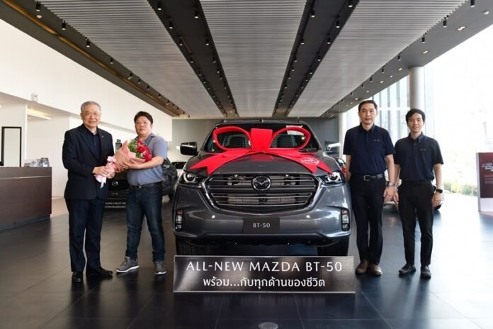 เมื่อเร็วๆ นี้ บริษัท มาสด้า (เซลส์) ประเทศไทย จำกัด นำโดย นายชาญชัย ตระการอุดมสุข ประธานบริหาร (ซ้ายสุด) พร้อมด้วย นายจารุรัฐ ปิงคลาศัย (ที่สองจากขวา) ประธานเจ้าหน้าที่บริหาร บริษัท มาสด้า ชลบุรี จำกัด (มหาชน) และ นายณัฐกุล ปิงคลาศัย (ขวาสุด) ผู้จัดการทั่วไป บริษัท มาสด้า ชลบุรี จำกัด (มหาชน) สาขากาญจนาภิเษก ร่วมส่งมอบ ALL-NEW MAZDA BT-50 รถปิกอัพเจเนอเรชั่นใหม่ที่ผนวกคุณสมบัติของปิกอัพที่ดีที่สุดในโลกรวมเป็นหนึ่งเดียวให้กับลูกค้า ณ โชว์รูมมาสด้า เจพี กาญจนาภิเษก ซึ่งรถรุ่นนี้กำลังประสบความสำเร็จอย่างท่วมท้น และได้รับเสียงตอบรับเป็นอย่างดีจากลูกค้าทั่วประเทศท่ามกลางการระบาดของโควิด-19 ตอกย้ำถึงอีกหนึ่งก้าวแห่งความสำเร็จของมาสด้าในการพัฒนา และส่งมอบยนตรกรรมที่ตอบโจทย์ความต้องการลูกค้าได้อย่างแท้จริงในทุกสถานการณ์