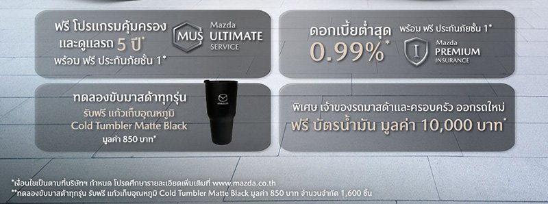 • มอบความอุ่นใจตลอดการครอบครองกับโปรแกรมคุ้มครองและดูแลรถตลอด 5 ปี Mazda Ultimate Service (MUS)2 ช่วยให้ลูกค้าเบาใจเรื่องค่าใช้จ่ายในอนาคต โดยครอบคลุมทั้งการรับประกันคุณภาพรถ บำรุงรักษารถตามระยะ และบริการช่วยเหลือฉุกเฉิน 24 ชั่วโมง มูลค่าโปรแกรมฯ สูงสุด 62,568 บาท4