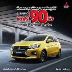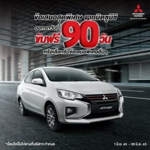 บริษัท มิตซูบิชิ มอเตอร์ส (ประเทศไทย) จำกัด มอบข้อเสนอสุดพิเศษ ‘ขับฟรี 90 วัน’ สำหรับลูกค้าที่ซื้อรถยนต์มิตซูบิชิรุ่นใดก็ได้ภายในวันที่ 30 มิถุนายน 2563 และรับรถภายในวันที่ 31 กรกฎาคม 2563 นี้ เมื่อทำสัญญาเช่าซื้อกับสถาบันการเงินที่ร่วมรายการ