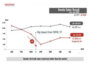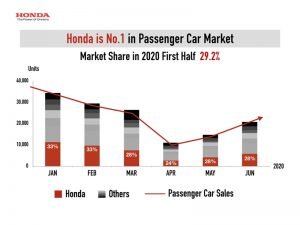 ในช่วงเดือนมีนาคมและเมษายนที่สถานการณ์โควิด-19 มีการแพร่ระบาดอย่างรุนแรง ส่งผลกระทบต่อยอดขายรถยนต์เป็นอย่างมาก แต่มีทิศทางที่ดีขึ้นด้วยยอดขายที่เริ่มฟื้นกลับขึ้นมาตั้งแต่ช่วงเดือนพฤษภาคม ส่งผลให้ 6 เดือนแรกของปีนี้ ฮอนด้ามียอดขายรวม 41,326 คัน มีส่วนแบ่งการตลาดอยู่ที่ 29.2% ซึ่งสามารถครองยอดขายเป็นอันดับหนึ่งในตลาดรถยนต์นั่งส่วนบุคคล แต่เมื่อเทียบกับช่วงเดียวกันของปีที่ผ่านมา มีอัตราลดลง 36.1% ซึ่งถึงแม้จะได้รับผลกระทบจากสถานการณ์โควิด-19 แต่ฮอนด้าก็ยังมีอัตราการเติบโตที่ดีกว่าตลาดรถยนต์ส่วนบุคคลโดยรวมสำหรับยอดขายรถยนต์ฮอนด้า ช่วง 6 เดือนแรกของปี 2563 (มกราคม – มิถุนายน 2563) แบ่งตามเซกเมนต์ ประกอบด้วย