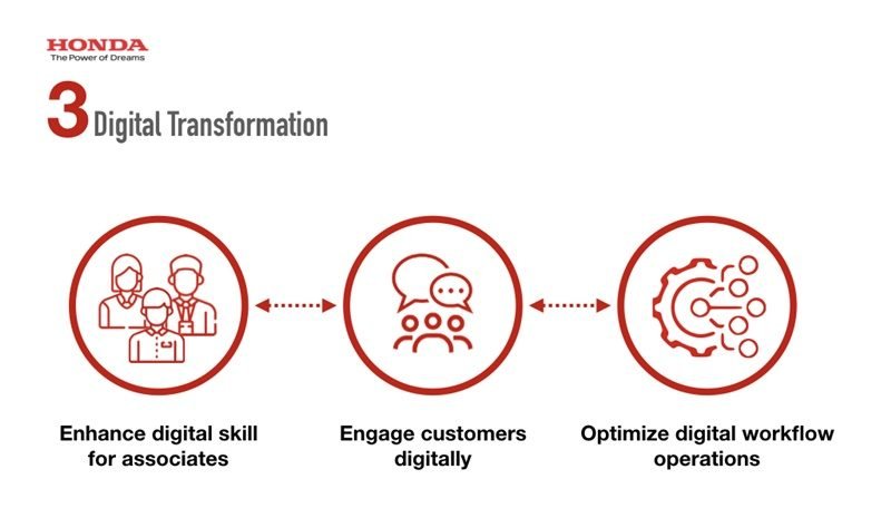 สร้างพื้นฐานที่แข็งแกร่งของทั้งองค์กร โดยนำดิจิทัล เทคโนโลยีมาใช้ เพื่อส่งเสริมขีดความสามารถในการแข่งขันในตลาด และเพื่อมอบประสบการณ์ที่น่าประทับใจให้กับลูกค้า ซึ่งในยุคที่มีการแข่งขันสูง Digital Transformation มีส่วนสำคัญในการสร้างศักยภาพในการแข่งขัน ฮอนด้าได้เน้นการสร้างพื้นฐานทางด้านดิจิทัลทุกส่วนงาน มุ่งยกระดับทักษะของพนักงานทางด้านดิจิทัล มีการเชื่อมโยงข้อมูล พร้อมนำไปวิเคราะห์ร่วมกับการศึกษาพฤติกรรมของผู้บริโภค เพื่อการพัฒนารูปแบบการนำเสนอผลิตภัณฑ์ การบริการ และการสื่อสารทางการตลาด ไปสู่สิ่งที่ลูกค้าคาดหวังได้อย่างมีประสิทธิภาพสูงสุด