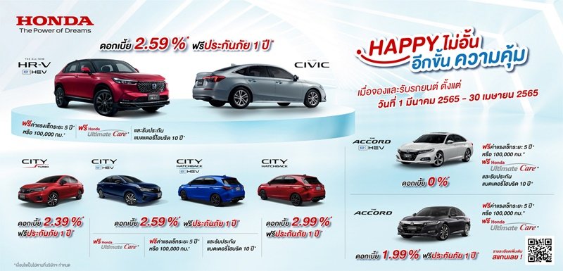 - ไลน์อัปยนตรกรรมเทอร์โบ มาพร้อมดีเอ็นเอความสปอร์ต ที่ให้ทั้งความแรงแต่ยังคงไว้ซึ่งอัตราการประหยัดน้ำมันที่ดีเยี่ยม ได้แก่ ฮอนด้า ซิตี้ เทอร์โบ ฮอนด้า ซิตี้ แฮทช์แบ็ก ฮอนด้า แอคคอร์ด เทอร์โบ และไฮไลต์ในกลุ่มนี้ คือ ฮอนด้า ซีวิค ใหม่ ยนตรกรรมสปอร์ตพรีเมียมซีดานยอดนิยม ดีไซน์ภายนอกสปอร์ตพรีเมียมในทุกมุมมอง ภายในห้องโดยสารกว้างขวางสะดวกสบาย นอกจากนี้ ในทุกรุ่นย่อย ให้ความแรงทรงพลังเร้าใจเกินใคร ด้วยเครื่องยนต์ VTEC TURBO 1.5 ลิตร ใหม่ พร้อมระบบเกียร์ CVT ให้กำลังสูงสุด 178 แรงม้า ให้อัตราการประหยัดน้ำมันดีเยี่ยม 17.2 กม./ลิตร ทั้งยังรองรับพลังงานทางเลือก E85 และมาพร้อมเทคโนโลยีความปลอดภัยอัจฉริยะ Honda SENSING สะดวกสบายแบบเหนือกว่ากับครั้งแรกของระบบควบคุมประตูแบบอัจฉริยะพร้อม Honda Smart Key Card ครบครันด้วยเทคโนโลยีเพื่อความสะดวกสบายและเทคโนโลยีความปลอดภัยอันล้ำสมัย โดยรับข้อเสนอ ดอกเบี้ย 2.59%* พร้อมฟรีประกันภัย 1 ปี* เมื่อจองและรับรถตั้งแต่วันที่ 1 มีนาคม 2565 – 30 เมษายน 2565