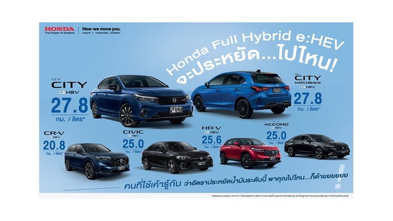 - กลุ่ม SUV นำโดย ฮอนด้า ซีอาร์-วี อี:เอชอีวี ยนตรกรรมพรีเมียมเอสยูวี โดยล่าสุดได้รับรางวัล รถยอดเยี่ยมประเภทไฮบริดเอสยูวีขนาดกลาง ในงาน Car of the Year 2024 มาพร้อมเทคโนโลยีการขับเคลื่อน Full Hybrid ที่ แรง ทรงพลัง และประหยัดน้ำมันสูงสุดถึง 8 กม./ลิตร (รุ่น e:HEV ES) ครบครันด้วยเทคโนโลยีอำนวยความสะดวกสบายและความปลอดภัยระดับพรีเมียมพร้อมเติมเต็มทุกความอเนกประสงค์และตอบโจทย์การใช้ชีวิตทั้งไลฟ์สไตล์ในเมืองและนอกเมืองอย่างลงตัว ในราคาเริ่มต้นที่ 1,589,000 บาท (รุ่น e:HEV ES)