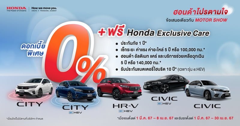 โดยแต่ละรุ่นมาพร้อมข้อเสนอพิเศษ*** กับ ‘ฮอนด้าโปรตามใจ’ ไม่ว่าจะเป็น ดอกเบี้ยพิเศษเริ่มต้น 0% พร้อม ฮอนด้า เอ็กซ์คลูซีฟ แคร์ (Honda Exclusive Care) หรือทางเลือก ดับเบิ้ล สไมล์ พลัส** ดาวน์เริ่มต้นน้อย ผ่อนต่อเดือนต่ำ เสริมความมั่นใจยิ่งขึ้นสำหรับรุ่น e:HEV ด้วยการรับประกันอายุการใช้งานแบตเตอรี่ไฮบริดถึง 10 ปี และรับประกันระบบไฮบริดทั้งระบบ 5 ปี ไม่จำกัดระยะทาง สำหรับลูกค้าที่จองตั้งแต่ 1 มีนาคม 2567 – 8 เมษายน 2567 และรับรถตั้งแต่ 1 มีนาคม 2567 – 30 เมษายน 2567