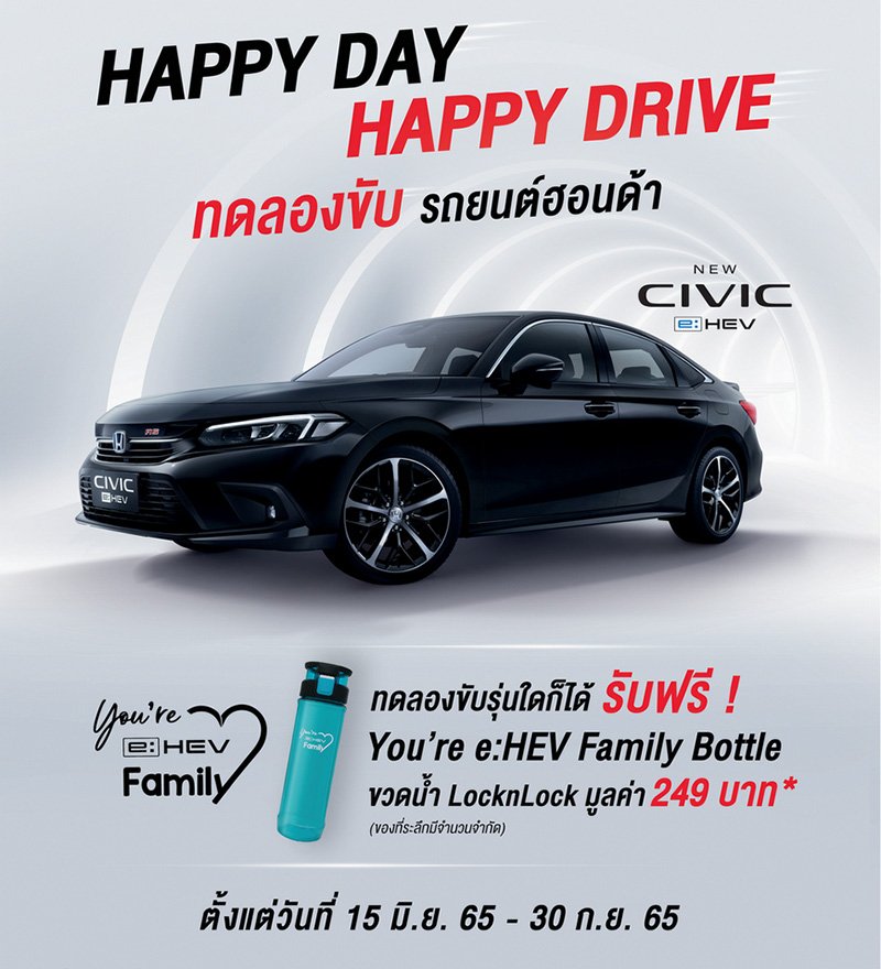 วันที่ 15 มิถุนายน 2565 – 30 กันยายน 2565 พร้อมรับของสมนาคุณ “You’re e:HEV Family Bottle ขวดน้ำ LocknLock” มูลค่า 249 บาท** ฟรี สอบถามรายละเอียดเพิ่มเติมได้ที่โชว์รูมฮอนด้าทั่วประเทศ หรืออ่านข้อมูลทางเว็บไซต์ www.honda.co.th/testdrive