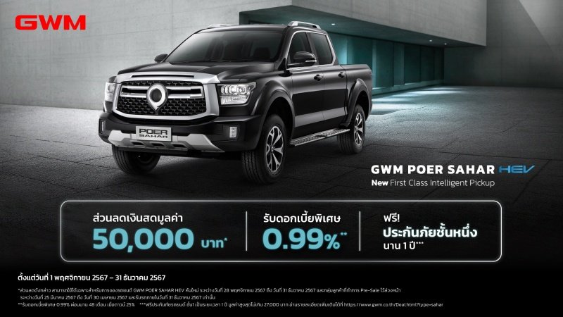 พิเศษสุด สำหรับผู้ที่จอง GWM POER SAHAR HEV ที่จองรถในช่วง Pre-sale และภายในงาน Thailand International Motor Expo ครั้งที่ 41 จนถึงวันที่ 31 ธันวาคม 2567 นี้ รับส่วนลดมูลค่า 50,000 บาท ดอกเบี้ยพิเศษ 0.99% ผ่อน 48 เดือน ฟรี ประกันภัยชั้นหนึ่ง 1 ปีเต็ม ฟรี บริการระบบตรวจสอบและสั่งการรถผ่านอินเทอร์เน็ต* (Telematic Service) พร้อมแพ็กเกจอินเทอร์เน็ตภายในรถ (Internet in Vehicle) ระยะเวลา 3 ปี ฟรี ค่าแรงบำรุงรักษาตามระยะทางภายในระยะเวลา 5 ปี หรือระยะทาง 100,000 กิโลเมตร (แล้วแต่อย่างใดอย่างหนึ่งถึงก่อน และไม่รวมอะไหล่สิ้นเปลือง) ฟรี บริการช่วยเหลือฉุกเฉิน (Roadside Assistance) ตลอด 24 ชั่วโมง เป็นระยะเวลา 5 ปี พร้อมการรับประกันคุณภาพรถใหม่ ครอบคลุมระยะเวลา 5 ปี หรือระยะทาง 150,000 กิโลเมตร** (แล้วแต่อย่างใดอย่างหนึ่งถึงก่อน)