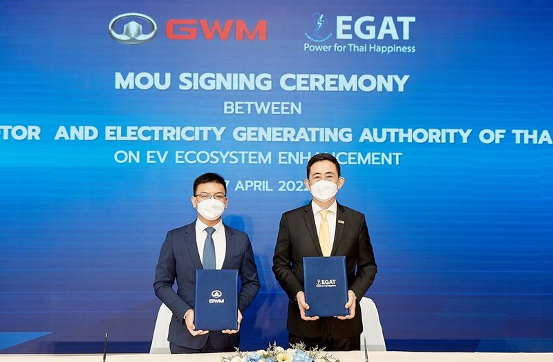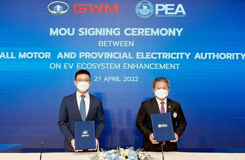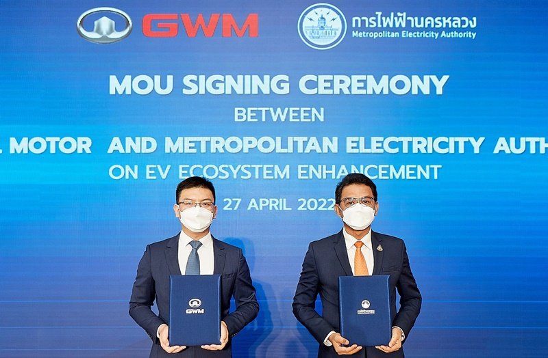 พิธีลงนามบันทึกข้อตกลงความร่วมมือจัดขึ้นเมื่อวันที่ 27 เมษายน 2565 ซึ่งนายสุพัฒนพงษ์ พันธ์มีเชาว์ รองนายกรัฐมนตรี และรัฐมนตรีว่าการกระทรวงพลังงาน ได้ให้เกียรติเป็นประธานในพิธี โดยมี มร. ไมเคิล ฉง รองประธาน เกรท วอลล์ มอเตอร์ (ประเทศไทย) นายบุญญนิตย์ วงศ์รักมิตร ผู้ว่าการการไฟฟ้าฝ่ายผลิตแห่งประเทศไทย นายวิลาศ เฉลยสัตย์ ผู้ว่าการการไฟฟ้านครหลวง และนายศุภชัย เอกอุ่น ผู้ว่าการการไฟฟ้าส่วนภูมิภาค เป็นผู้ลงนาม ณ GWM Experience Center ไอคอนสยาม พร้อมด้วยทีมผู้บริหารระดับสูงจาก เกรท วอลล์ มอเตอร์ ได้แก่ นายณรงค์ สีตลายน กรรมการผู้จัดการ และนายครรชิต ไชยสุโพธิ์ รองประธาน ฝ่ายกิจการองค์กรและรัฐกิจสัมพันธ์ เกรท วอลล์ มอเตอร์ (ประเทศไทย) ร่วมเป็นสักขีพยานในพิธี