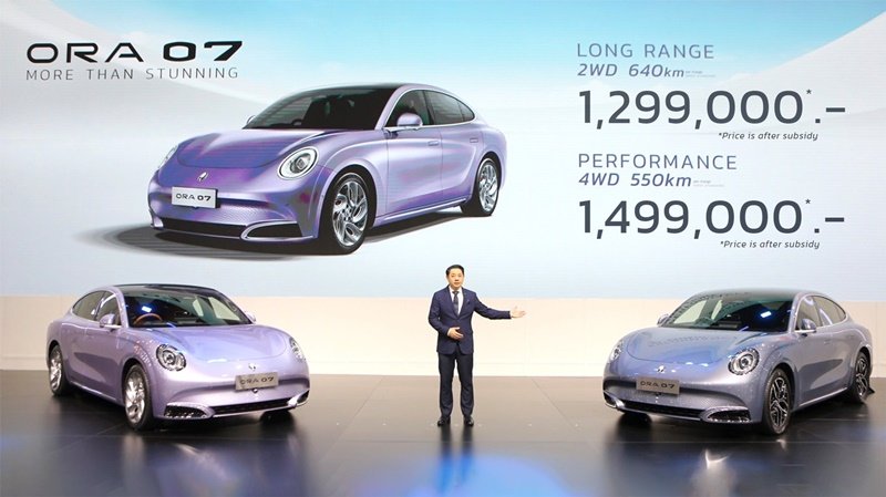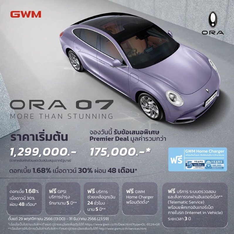 เกรท วอลล์ มอเตอร์ ประกาศความสำเร็จของ Mission 9 in 3 ส่งยานยนต์ไฟฟ้า 100% เรือธงรุ่นล่าสุดสู่ตลาดไทย เปิดตัวและประกาศราคา ORA 07 อย่างเป็นทางการภายในงานมหกรรมยานยนต์ ครั้งที่ 40 หรือ Motor Expo 2023 เสริมทัพไลน์อัปยานยนต์พลังงานใหม่คุณภาพลำดับที่ 9 สู่ตลาดประเทศไทย โดยราคาอย่างเป็นทางการของ ORA 07 รุ่น LONG RANGE อยู่ที่ 1,299,000 บาท และราคาของ ORA 07 รุ่น PERFORMANCE อยู่ที่ 1,499,000 บาท โดยลูกค้าที่สนใจสามารถจับจองเป็นเจ้าของได้ตั้งแต่วันที่ 29 พฤศจิกายน 2566 เวลา 13.00 น. เป็นต้นไป ผ่านช่องทางแอปพลิเคชัน GWM และเว็บไซต์ www.gwm.co.th นอกจากนี้ ลูกค้าที่สนใจสามารถสัมผัสและทดลองขับ ORA 07 คันจริงได้ที่ GWM Partner Store อีกด้วย พร้อมกันนี้ เกรท วอลล์ มอเตอร์ ยังขนทัพยานยนต์ไฟฟ้าขวัญใจชาวไทยอีกหลากหลายรุ่นมาจัดแสดง และจัดเต็มข้อเสนอสุดพิเศษพร้อมกิจกรรมสุดสนุกอีกมากมายภายในงาน Motor Expo 2023