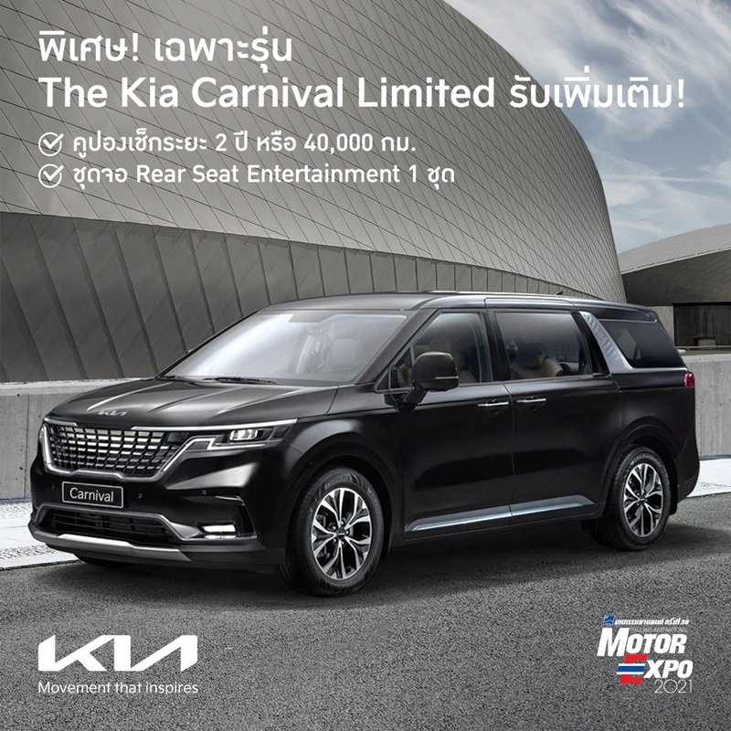สำหรับลูกค้าที่สนใจ สามารถสัมผัสกับยนตรกรรมเกีย คาร์นิวัล ใหม่ ทั้ง 3 รุ่นย่อย ทุกสี พร้อมทดลองขับได้ที่งานมหกรรมยานยนต์ ครั้งที่ 38 ณ บูธเกีย B04 ชาเลนเจอร์ฮอลล์ 1–3 อิมแพ็ค เมืองทองธานี ระหว่างวันที่ 2 – 12 ธันวาคม 2564 หรือสอบถามรายละเอียดเพิ่มเติมได้ที่โชว์รูมเกียทุกสาขาทั่วประเทศ หรือ ทางเว็บไซต์ที่ www.kia.com โทรศัพท์ 02–915–1991 และสามารถติดตามข่าวสาร Kia Thailand เพิ่มเติมได้ที่ Facebook Page: KIA Thailand หรือ ที่ LINE Official Account: @kia.thailand