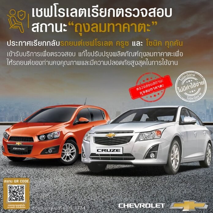 นายวันชนะ อูนากูล ผู้อำนวยการทั่วไป ฝ่ายบริการหลังการขายและส่งออก บริษัท เชฟโรเลต เซลส์ (ประเทศไทย) จำกัด กล่าวว่า “ฝ่ายบริการหลังการขายของเชฟโรเลตได้ทำการติดตาม ตรวจสอบและเปลี่ยนถุงลมนิรภัยใบใหม่ให้กับผู้ใช้รถยนต์ของเชฟโรเลต ครูซ และเชฟโรเลต โซนิค ไปแล้วกว่า 30,000 คัน ในช่วงหลายเดือนที่ผ่านมา แต่ยังมีผู้ใช้รถยนต์ทั้งสองรุ่นที่ยังไม่ได้นำรถยนต์ของท่านมารับการตรวจสอบ ดังนั้นเชฟโรเลต ประเทศไทย ขอให้ท่านเจ้าของรถยนต์รุ่นดังกล่าวนำรถยนต์มาที่ศูนย์บริการมาตรฐานของเชฟโรเลตโดยเร็วที่สุดโดยไม่เสียค่าใช้จ่ายเพิ่มเติม เพื่อให้รถยนต์ของท่านมีความปลอดภัยสูงสุดในการใช้งาน”