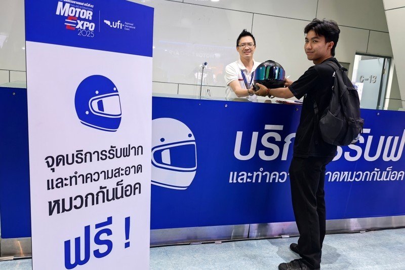 นอกจากนี้ สำหรับผู้ขี่รถจักรยานยนต์ไปชมงาน ยังมีบริการรับฝาก และทำความสะอาดหมวกกันน็อค ฟรี ! ที่ประตูทางเข้า อาคารชาลเลนเจอร์ 3
