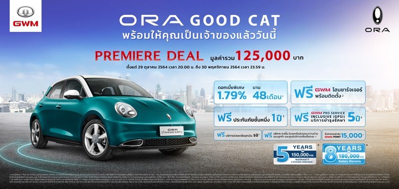 ในโอกาสนี้ เกรท วอลล์ มอเตอร์ ยังได้ส่งมอบแคมเปญ ORA Good Cat PREMIERE DEAL สำหรับช่วงการเปิดตัวในระหว่างวันที่ 29 ตุลาคม พ.ศ.2564 เวลา 20.00 น. ถึงวันที่ 30 พฤศจิกายน พ.ศ.2564 เวลา 23.59 น. ที่อัดแน่นไปด้วยข้อเสนอสุดพิเศษมากมาย อาทิ