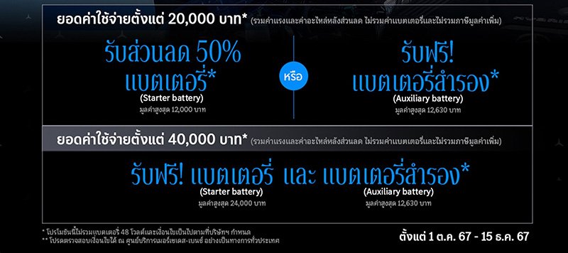 เมอร์เซเดส-เบนซ์ ประเทศไทย ขยายเวลาแคมเปญกลางปี 2567 มอบส่วนลดและสิทธิประโยชน์ในกลุ่มของแบตเตอรี่ (Starter Battery) และแบตเตอรี่สำรอง (Auxiliary Battery) ให้ทุกการเดินทางของลูกค้าปัจจุบันเป็นไปอย่างสะดวกสบายแบบเต็มพิกัด พร้อมยกระดับบริการหลังการขาย เพื่อสร้างประสบการณ์ใหม่ให้กับลูกค้าคนสำคัญอย่างต่อเนื่อง ผ่านแคมเปญ “Power your Star” เมื่อนำรถยนต์เมอร์เซเดส-เบนซ์ ทุกรุ่น ทุกช่วงอายุของรถยนต์ (รวมรถ Van) มาเข้ารับบริการ ณ ศูนย์บริการเมอร์เซเดส-เบนซ์ อย่างเป็นทางการ และมียอดค่าใช้จ่ายผ่านศูนย์บริการฯ ตามที่กำหนด ในช่วงระยะเวลาของแคมเปญ ระหว่างวันที่ 1 ตุลาคม 2567 – 15 ธันวาคม 2567 จะได้รับสิทธิพิเศษ ดังนี้