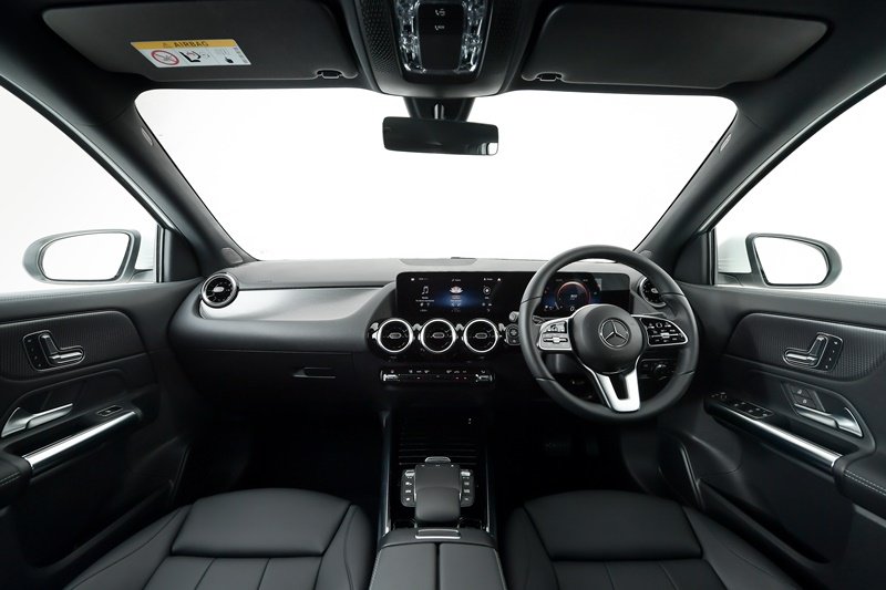 ภายในห้องโดยสารตกแต่งแบบ Progressive เช่นกัน และให้สัมผัสของการสร้างสรรค์สเกลการออกแบบใหม่ในทุกรายละเอียดด้วยสไตล์ที่ให้ความรู้สึกสปอร์ต โมเดิร์น ทั้งยังเพิ่มความกว้างขวางเข้ามาในรถยนต์ขนาดคอมแพ็ครุ่นนี้ในแบบที่สัมผัสได้ทันทีเมื่อเข้ามานั่งอยู่ภายในห้องโดยสาร มอบความสะดวกสบายให้กับผู้โดยสารทุกที่นั่งพร้อมการออกแบบภายในห้องโดยสารให้มีบรรยากาศที่เรียบหรูด้วยเบาะหนังชนิด ARTICO สีดำพร้อมเดินด้วยด้ายสีเงินตลอดทั้งคัน เข้ากันกับวัสดุตกแต่งภายในห้องโดยสารที่สร้างสรรค์ขึ้นด้วยลวดลาย 3 มิติแบบ Spiral-look trim นอกจากนี้ ในส่วนของหน้าปัดที่ดูล้ำสมัยด้วยการออกแบบทรงปีกนกที่ทอดยาวตั้งแต่ประตูหน้าผ่านคอนโซลกลางอย่างไร้รอยต่อ เชื่อมไปจนถึงด้านบนของแผงหน้าปัดฝั่งผู้ขับขี่ที่มาพร้อมกับหน้าจอ Widescreen ขนาด 10.25 นิ้ว สำหรับหน้าจอ MBUX และขนาด 7 นิ้ว สำหรับหน้าจอเรือนไมล์เพื่อแสดงมาตรวัดต่างๆ ต่อกัน 2 หน้าจอ เป็นอุปกรณ์มาตรฐาน โดยหน้าจอทั้งสองจะอยู่ติดกันและมีลักษณะลอยตัวแบ่งการแสดงผลเป็น 2 ส่วน ซึ่งเป็นหน้าจอแบบ Digital display เพื่อให้ผู้ขับขี่มองเห็นได้ชัดเจน และอีกส่วนหนึ่งจะเป็นหน้าจออินโฟเทนเมนต์ พร้อมระบบปฏิบัติการหน้าจอแบบ MBUX ที่ใช้ระบบสัมผัส (Touchscreen) โดยผู้ขับขี่สามารถควบคุมและออกคำสั่งได้ด้วยการสัมผัสที่หน้าจอ หรือใช้ Touchpad ดีไซน์ใหม่ ส่วนช่องลมของเครื่องปรับอากาศนั้นได้รับการออกแบบโดยได้แรงบันดาลใจมาจากใบพัดของเครื่องบินเจ็ต (turbine) เป็นต้นแบบ นอกจากนี้ยังมีรายละเอียดแบบสปอร์ตที่ถูกบรรจุไว้ในทุกส่วน อาทิ พวงมาลัยมัลติฟังก์ชันที่ตกแต่งแบบสปอร์ตหุ้มด้วยหนัง ช่วยเพิ่มเอกลักษณ์ความสปอร์ตให้โดดเด่นยิ่งขึ้น