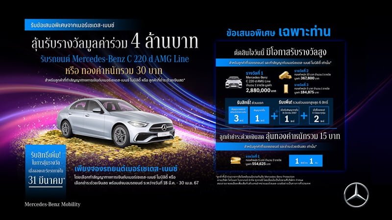 และข้อเสนอสุดยิ่งใหญ่จากเมอร์เซเดส-เบนซ์ โมบิลิตี้ ลุ้นรับรถเมอร์เซเดส-เบนซ์ C 220 d AMG Line มูลค่า 2,880,000 บาท พร้อมชิงทองคำหนักรวม 30 บาท มูลค่ารวมทั้งสิ้น 4 ล้านบาท เมื่อจองรถยนต์ใหม่เมอร์เซเดส-เบนซ์ และทำสัญญาทางการเงินกับเมอร์เซเดส-เบนซ์ โมบิลิตี้ ระหว่างวันที่ 18 มีนาคม – 30 เมษายน 2567 พร้อมเริ่มต้นสัญญาทางการเงินภายในวันที่ 30 มิถุนายน 2567