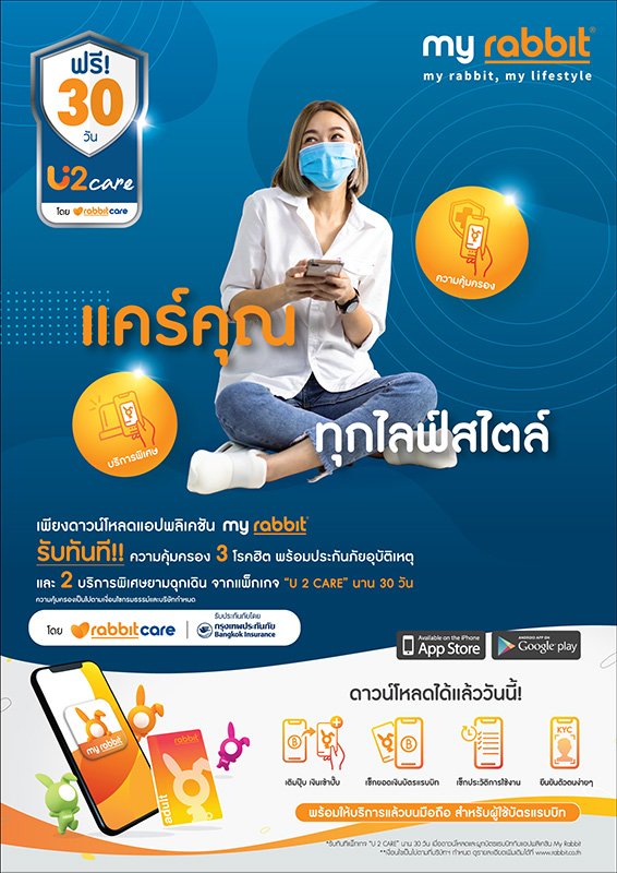 แอปพลิเคชัน My Rabbit และกดรับสิทธิ์ในแอปพลิเคชันจะได้รับความคุ้มครองประกันภัยฟรี นาน 30 วัน ซึ่งได้แก่ ความคุ้มครองการเจ็บป่วย 3 โรคฮิตและผลประโยชน์เงินชดเชยปลอบขวัญและเงินชดเชยรายวันกรณีเป็นผู้ป่วยใน รวมถึงการประกันภัยอุบัติเหตุซึ่งคุ้มครองการเสียชีวิต การสูญเสียอวัยวะ สายตาหรือทุพพลภาพถาวรสิ้นเชิง การบริการให้คำปรึกษาแพทย์ทางไกลผ่านวิดีโอคอล (Tele Medicine) และบริการเรียกรถฉุกเฉิน”