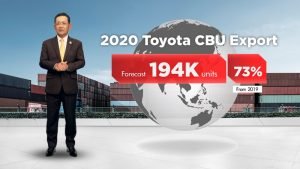 สำหรับการส่งออกในครึ่งปีแรก 2563 ของโตโยต้าได้ส่งออกรถยนต์สำเร็จรูปจำนวนทั้งสิ้น 97,000 คัน ลดลง 30% จากช่วงเวลาเดียวกันของปีที่ผ่านมา อย่างไรก็ดี เราได้เห็นสัญญาณเชิงบวกจากในภูมิภาคโอเชียเนียและบางประเทศในทวีปเอเชีย ด้วยเหตุนี้ เราจึงปรับการคาดการณ์การส่งออกรถยนต์สำเร็จรูปสำหรับปีนี้ทั้งปี อยู่ที่ 194,000 คัน หรือคิดเป็น 73% เมื่อเทียบกับปีที่แล้ว ในส่วนของการผลิตรถยนต์ของเรานั้น ก็เป็นไปตามสภาวะของตลาดรถยนต์ทั้งในประเทศและต่างประเทศซึ่งมีแนวโน้มเติบโตขึ้นเหนือกว่าที่เราได้คาดการณ์ไว้ ดังนั้น จำนวนการผลิตรถยนต์ของโตโยต้าในปี 2563 จะอยู่ในระดับที่ 408,000 คัน คิดเป็น 71% เมื่อเทียบกับยอดการผลิตของปีที่ผ่านมา”
