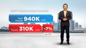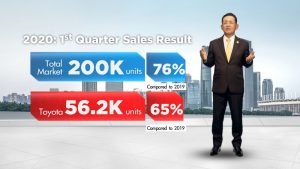 มร.ซึงาตะ กล่าวว่า “ในช่วงต้นปีที่ผ่านมา เดิมมีการคาดการณ์ตลาดรวมในประเทศของปี 2563 อยู่ที่ 940,000 คัน และตั้งเป้าหมายการขายรถยนต์โตโยต้าไว้ที่ 310,000 คัน แต่ทว่าในสถานการณ์ไตรมาสที่ 1 ตัวเลขยอดขายตลาดรวมอยู่ที่ประมาณ 200,000 คัน หรือคิดเป็น 76% ของยอดขายในช่วงเวลาเดียวกันของปีที่ผ่านมา โดยโตโยต้ามียอดขายอยู่ที่ 56,200 คัน คิดเป็น 65% ของยอดขายในช่วงเวลาเดียวกันของปีที่แล้ว