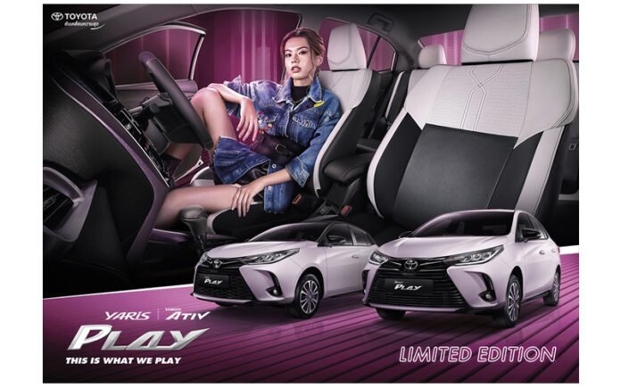YARIS และ ATIV รุ่นพิเศษ “PLAY” (Limited Edition) ถูกพัฒนาเพื่อตอบโจทย์การใช้งานในชีวิตประจำวันของคนรุ่นใหม่ ดีไซน์ใหม่ทั้งภายนอกและภายใน โดยมีสัญลักษณ์ชื่อรุ่น “PLAY” ท้ายรถ เพิ่มสีภายนอกใหม่ “Ice Pink Metallic” พร้อมกระจังหน้าด้านบนสีดำเงา และล้ออัลลอยปัดเงาสีทูโทน “Dark Mulberry” ลายใหม่ เพิ่มลูกเล่นด้วยการตกแต่งภายในห้องโดยสารให้มีดีไซน์พรีเมียม โดดเด่น พร้อมโทนสีใหม่ “Dark Mulberry” และเบาะหนังสีทูโทนขาว-ดำ ตกแต่งด้วยด้ายสี “Dark Mulberry” เพิ่มอุปกรณ์อำนวยความสะดวก ไม่ว่าจะเป็น ระบบปรับอากาศพร้อมแผ่นกรองอากาศ PM 2.5 กระจกหน้า “Acoustic Glass” แบบช่วยดูดซับพลังงานความร้อน (High Solar Energy Absorption) สะดวกยิ่งกว่าด้วย “Trunk Organizer” ที่จัดเก็บสัมภาระท้ายรถ เพิ่มความมั่นใจเมื่อจอดรถกับกล้องมองรอบคัน “Panoramic View Monitor” มุมมอง 360 องศา ผ่านกล้อง 4 จุดรอบคัน แสดงภาพแบบเรียลไทม์ เพียบพร้อมด้วยเทคโนโลยีที่เชื่อมต่อผู้ขับและรถให้สนุกกับไลฟ์สไตล์ด้วยแอปพลิเคชัน “PLAY CONNECT Car Telematics” เพิ่มความมั่นใจในทุกเส้นทาง ตอบโจทย์ทุกรูปแบบการใช้ชีวิต