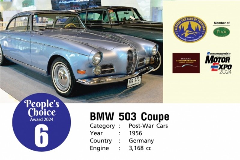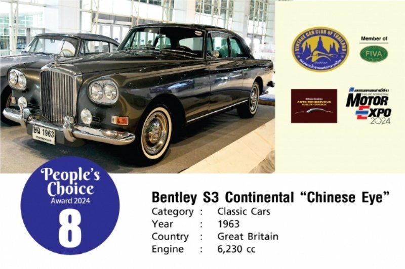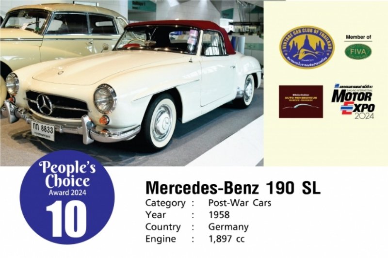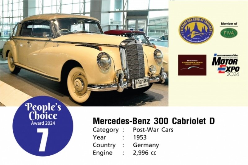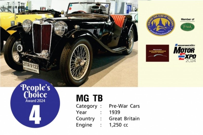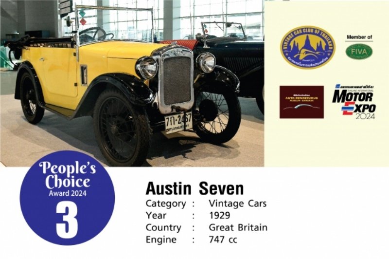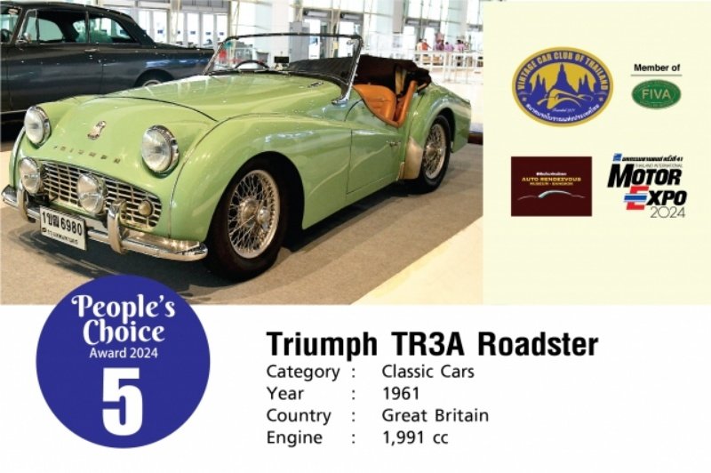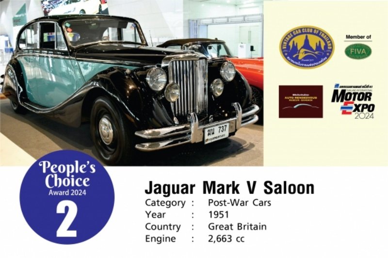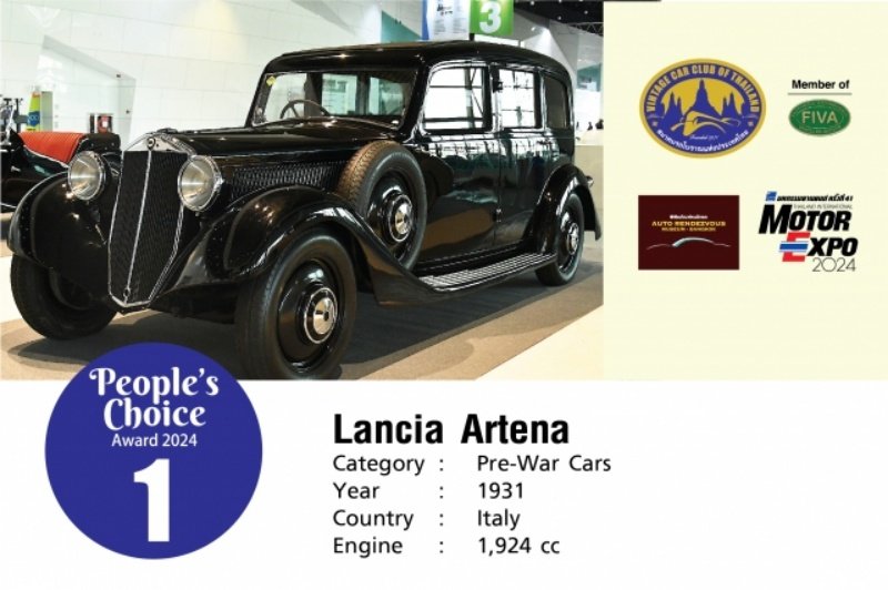 สมาคมรถโบราณแห่งประเทศไทย เชิญผู้ชมงาน “มหกรรมยานยนต์ ครั้งที่ 41” ร่วมโหวตรถโบราณ และรถคลาสสิคที่ประทับใจ ภายในบูธของสมาคมฯ พร้อมลุ้นรับของที่ระลึก รถที่ได้รับคะแนนจากผู้ชมงานสูงสุด จะคว้ารางวัล People’s Choice Award 2024 ไปครอง โดยเปิดให้โหวตถึงวันที่ 9 ธันวาคม 2567 เวลา 22.00 น. และประกาศผลวันที่ 10 ธันวาคม 2567 เวลา 14.00 น.