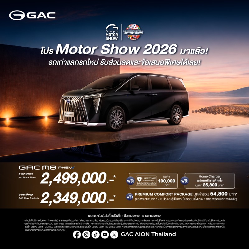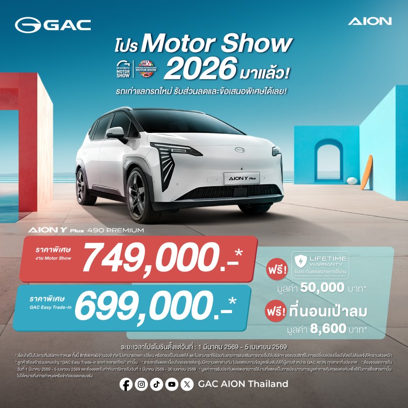 สำหรับลูกค้าที่สนใจสัมผัสประสบการณ์แห่งอนาคตและนวัตกรรมยานยนต์ไฟฟ้าระดับโลกจาก GAC สามารถเข้ามาชมรถคันจริงและร่วมทดลองขับรถยนต์พลังงานใหม่ทุกรุ่นจาก GAC ได้ที่บูธ GAC AION Thailand (บูธ A20) ณ อาคารชาเลนเจอร์ฮอลล์ 1 อิมแพ็ค เมืองทองธานี ตั้งแต่วันที่ 25 มีนาคม – 5 เมษายน 2569 หรือเข้าร่วมแคมเปญ Trade-in และสัมผัสตัวจริงได้ที่โชว์รูม GAC AION ทั่วประเทศ