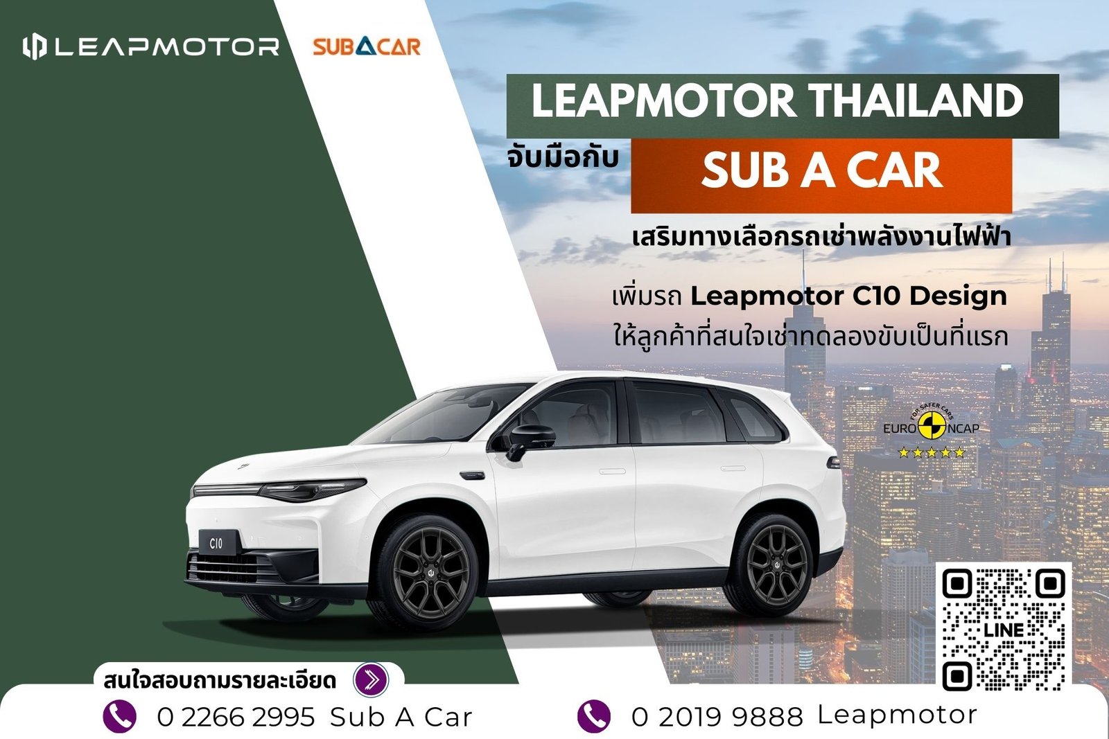 ความร่วมมือครั้งนี้นับเป็นครั้งแรกในตลาดที่ลูกค้าจะสามารถเช่าทดลองขับรถยนต์พลังงานไฟฟ้ารุ่น Leapmotor C10 Design ภายใต้แคมเปญ “Test Drive & Rent สัมผัสรถ EV ก่อนตัดสินใจ” พร้อมสร้างประสบการณ์การก่อนตัดสินใจซื้อ ด้วยการเปิดโอกาสให้ทดลองใช้งานจริงในชีวิตประจำวันซึ่งนานกว่าการทดลองขับรูปแบบเดิม เพื่อสัมผัสถึงสมรรถนะและฟังก์ชันต่าง ๆ ของรถยนต์อย่างเต็มที่ โดยรถยนต์พลังงานไฟฟ้ารุ่น Leapmotor C10 Design นับเป็นหนึ่งในสุดยอดยนตรกรรมอัจฉริยะเพื่อชีวิตที่สมบูรณ์แบบ ลูกค้าจะได้สัมผัสกับรถที่พัฒนาบนเทคโนโลยี Cell-to-Chassis ระบบขับเคลื่อนล้อหลัง และช่วงล่างที่ได้รับพัฒนาร่วมกับวิศวกรจาก Stellantis เพื่อเพิ่มความมั่นใจในการขับขี่และความปลอดภัยในระดับมาตรฐานของรถในยุโรป หลังคาพาโนรามิครูฟ ห้องโดยสารกว้าง นั่งสบายคุณภาพระดับพรีเมียม การันตีด้วยรางวัล CMF Design Award ด้านการออกแบบวัสดุ สี และพื้นผิว มั่นใจได้ในความปลอดภัยและเป็นมิตรกับทุกคนในครอบครัว ด้วยเบาะนั่งปราศจากสารอันตรายกับเด็กและยังได้รับการรับรองมาตรฐานสากลจาก Oeko-Tex และอีกหนึ่งฟังก์ชัน Nap Mode ที่จะเปลี่ยนรถให้เป็นพื้นที่พักผ่อนส่วนตัวด้วยการปรับเอนเบาะอัตโนมัติ พร้อมระบบ Ambient Light ที่สามารถเปลี่ยนสีได้ถึง 64 สี และระบบกรองฝุ่น PM 2.5 เพียบพร้อมไปด้วยระบบ ADAS และระบบช่วยในการขับขี่อีกด้วย