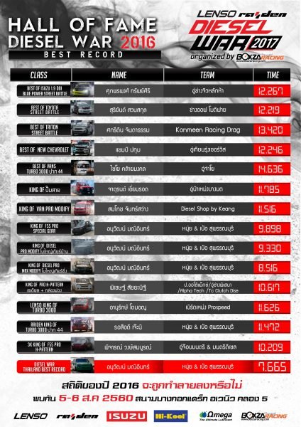 Lenso Raiden Diesel War 2017 ศึกแห่งศักดิ์ศรีของชาวดีเซล เตรียมระเบิดความมันส์ พร้อมจัดอันดับรถดีเซลที่เร็วที่สุดในประเทศไทยอีกครั้ง ในรูปแบบ Quarter Mile 402 เมตร ณ สนาม Bangkok Drag Avenue คลอง 5 ในวันที่ 5-6 สิงหาคม 2560 จัดโดย บริษัท เรซซิ่ง บ๊อกซ์ จำกัด ผู้ดำเนินกิจการเว็บไซต์ยานยนต์ BoxzaRacing.com