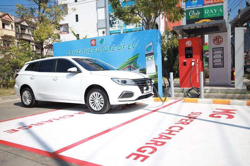 การร่วมมือกับ บริษัท บางจาก คอร์ปอเรชั่น จำกัด (มหาชน) ผู้นำด้านการเปลี่ยนผ่านพลังงาน เพื่อส่งเสริมการใช้งานรถยนต์พลังงานไฟฟ้าร่วมกันด้วยการติดตั้งสถานีชาร์จรถยนต์ไฟฟ้า MG Super Charge” ในสถานีบริการน้ำมันบางจากจะสร้างความสะดวกสบายให้กับผู้ใช้รถยนต์พลังงานไฟฟ้าเพิ่มมากขึ้น เนื่องจากคนไทยมีความคุ้นชินกับสถานีบริการน้ำมันซึ่งปัจจุบันไม่ได้เป็นเพียงสถานที่สำหรับเติมน้ำมันเท่านั้น แต่ยังได้รับการยกระดับด้วยฟังก์ชั่นไลฟ์สไตล์ เช่น ร้านกาแฟ ร้านอาหาร ซูเปอร์มาร์เก็ต ฯลฯ ซึ่งลูกค้าสามารถเข้าใช้บริการได้ในระหว่างรอการชาร์จรถยนต์พลังงานไฟฟ้าได้เช่นกัน