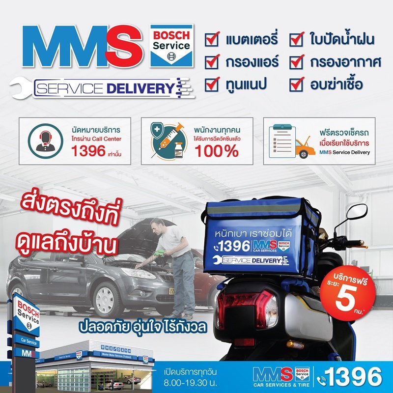 บริษัท มาสเตอร์ มอเตอร์ เซอร์วิสเซส (ประเทศไทย) จำกัด หรือ เอ็มเอ็มเอส บ๊อช คาร์ เซอร์วิส แอนด์ ไทร์ ภายใต้กลุ่มธุรกิจ มิลเลนเนียม กรุ๊ป คอร์ปอเรชั่น (เอเชีย) ศูนย์บริการรถยนต์ครบวงจร สำหรับรถญี่ปุ่นและยุโรปที่หมดระยะการรับประกัน เพิ่มความสะดวกพร้อมยกระดับการบริการด้วย ‘SERVICE DELIVERY’ ออกไปดูแลรถลูกค้าให้ถึงที่ กับหลากหลายโปรแกรมการบำรุงรักษาขั้นพื้นฐาน พร้อมบริการตรวจสภาพรถเบื้องต้น ผสานความมั่นใจด้วยบริการจากพนักงานที่ผ่านการฉีดวัคซีน โควิด-19 ครบทุกคน