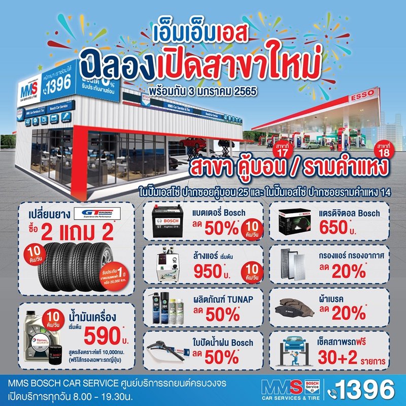 การตรวจสภาพตามระยะทาง, เปลี่ยนถ่ายของเหลว, แบตเตอรี่, ยาง, ช่วงล่าง, เบรก ไปจนถึงการซ่อมเครื่องยนต์และเกียร์อัตโนมัติ โดยทีมช่างมืออาชีพ พร้อมเครื่องมืออันทันสมัย รับประกันงานซ่อมสูงสุด 1 ปี หรือ 20,000 กิโลเมตร รวมถึงมีบริการพิเศษกรณีฉุกเฉิน ‘Service Delivery’ เช่น แบตเตอรี่หมด โดยลูกค้าสามารถผ่อนชำระ 0% ได้หลายรายการ ตอบโจทย์การบำรุงรักษารถยนต์แบบครบวงจร ลูกค้าสามารถเข้ารับบริการได้ที่ เอ็มเอ็มเอส บ๊อช คาร์ เซอร์วิส แอนด์ ไทร์ ทั้ง 17 สาขา คือ เกษตร-นวมินทร์, ประดิษฐ์มนูธรรม, พระราม 4, รามอินทรา,