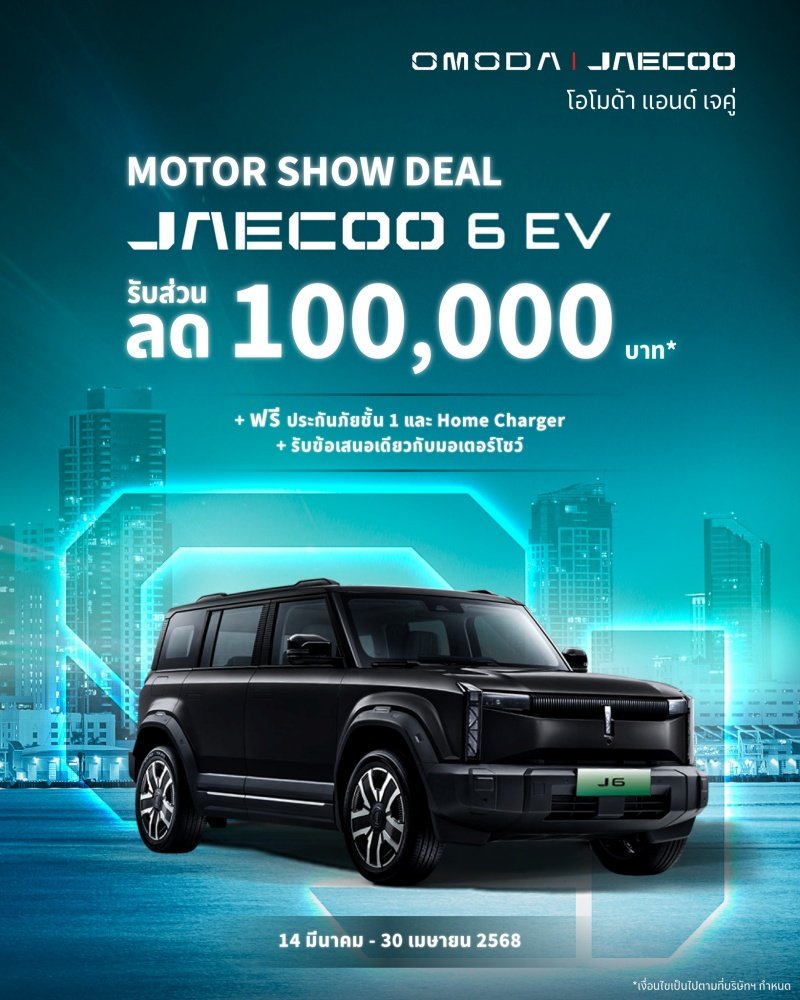 OMODA & JAECOO (อ่านว่า โอโมด้า แอนด์ เจคู่) ส่งมอบข้อเสนอสุดพิเศษสำหรับรถไฟฟ้า JAECOO 6 EV (หรือ iCAR 03 ในประเทศจีน) รถพลังงานไฟฟ้าแบบออฟโรด ที่ผสานจิตวิญญาณแห่งการผจญภัยแบบออฟโรดเข้ากับนวัตกรรมล้ำสมัย โดดเด่นด้วยดีไซน์ ONE BOX STYLE พร้อมท้าทายทุกเส้นทางอย่างไร้ขอบเขต ได้รับการยกย่องในด้านสมรรถนะการขับขี่ออฟโรดที่โดดเด่น ควบคู่ไปกับเทคโนโลยียานยนต์ไฟฟ้าที่ทันสมัย ทำให้ได้รับรางวัล “BEST OFF ROAD EV” ด้วยข้อเสนอสุดพิเศษนี้ จะทำให้การเป็นเจ้าของด้วยโปรโมชัน Motor Show Deal รถไฟฟ้าคันใหม่แบบไม่ต้องรอตัดสินใจ ตั้งแต่ 14 มีนาคม – 30 เมษายน2568 นี้เท่านั้น