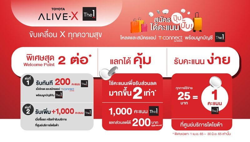 ในวันนี้ ผมขอนำเสนอ โครงการดีๆ อย่าง Toyota ALIVE-X หรือ ขับเคลื่อน x ทุกความสุข ที่เราได้ร่วมมือกับ The 1 ผู้นำดิจิทัลไลฟ์สไตล์และรอยัลตี้แพลตฟอร์มอันดับ 1 ของไทยที่มีเครือข่ายร้านค้าชั้นนำที่หลากหลาย ภายใต้กลุ่มเซ็นทรัลในการพัฒนาพัฒนาโปรแกรมสะสมคะแนน โครงการ Toyota ALIVE-X สำหรับลูกค้าโตโยต้าทุกคน ภายใต้ Platform T-Connect