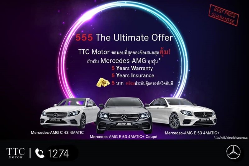 ในส่วนของ Mercedes-AMG มาพร้อม 555 The Ultimate Offer เพียงคุณเลือกจองรถ TTC Motor ในรถรุ่น Mercedes-AMG C 43 4MATIC ,Mercedes-AMG E 53 4MATIC+ และ Mercedes-AMG E 53 4MATIC+ Coupé